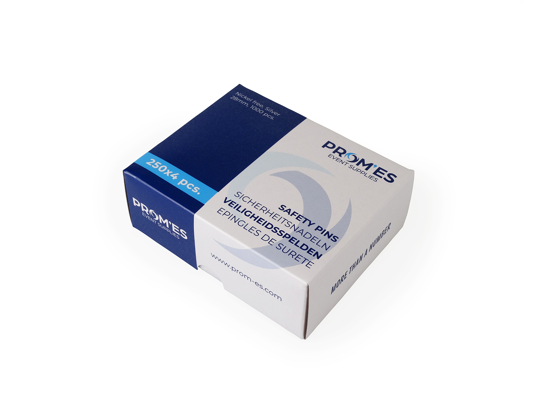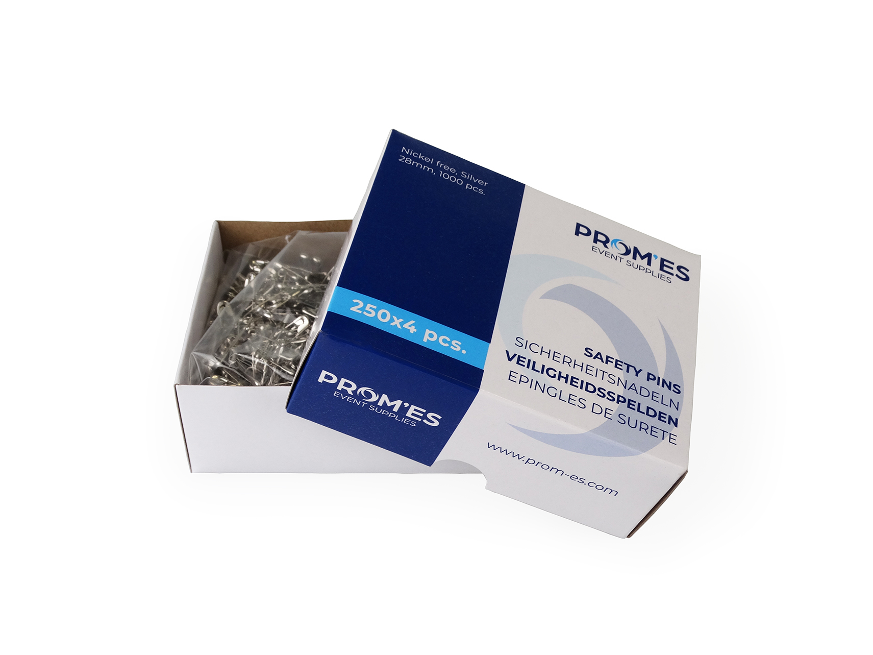The mini safety pins are 28 mm in size. 250 sets and 4 pieces per bundle. One box therefore contains 1,000 safety pins for running bibs. Are you looking for individual mini safety pins? Click here. The safety pins for race bibs are delivered from stock: from 1 box to 100+ boxes!